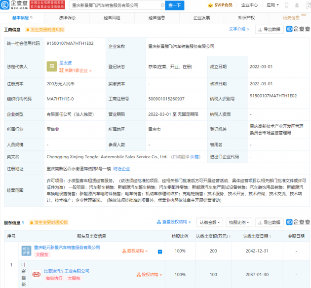 企查查APP显示,3月1日,重庆新景腾飞汽车销售服务有限公司成立,法定代表人为屈太波,注册资本200万元人民币,经营范围包含:新能源汽车整车销售;新能源汽车换电设施销售;充电桩销售等。企查查股权穿透显示,该公司由比亚迪汽车工业有限公司间接全资控股。