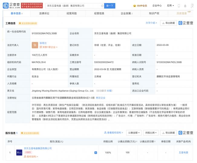 企查查APP显示,3月9日,京东五星电器(曲靖)集团有限公司成立,法定代表人为张琼兰,注册资本100万元人民币,经营范围包含:再生资源回收(除生产性废旧金属);家用电器安装服务;日用电器修理;会议及展览服务;企业形象策划等。企查查股权穿透显示,该公司由京东五星电器集团有限公司100%控股。