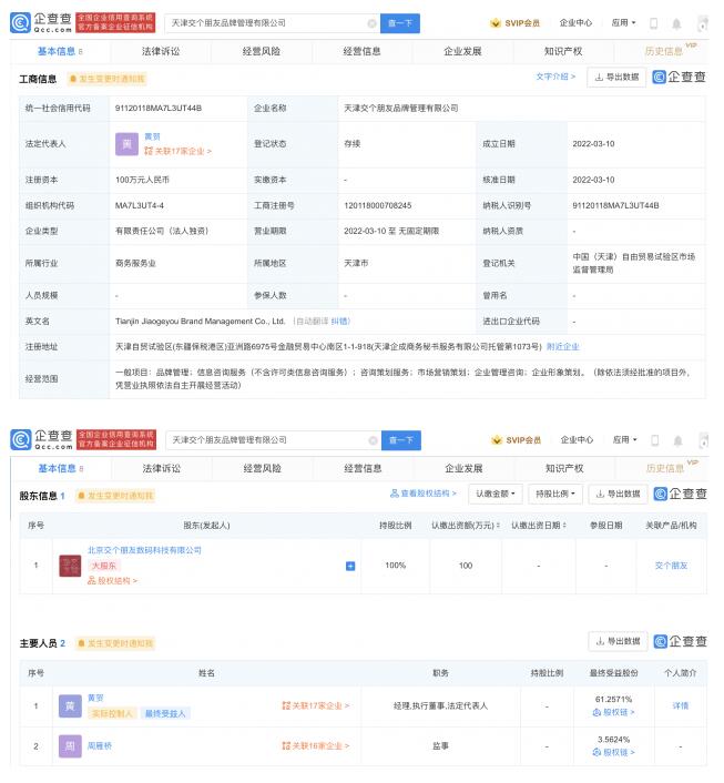 企查查APP显示,3月10日,天津交个朋友品牌管理有限公司成立,注册资本100万元人民币,法定代表人及执行董事为黄贺,周雁桥任监事,公司经营范围包含:品牌管理;企业管理咨询;企业形象策划等。企查查股权穿透显示,该公司由北京交个朋友数码科技有限公司100%控股。据悉,黄贺、周雁桥都是罗永浩“交个朋友直播间”的团队成员。