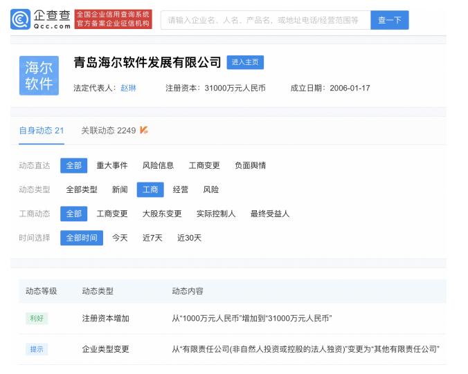 关键词: 青岛海尔软件 工商变更 注册资本 云计算设备制造